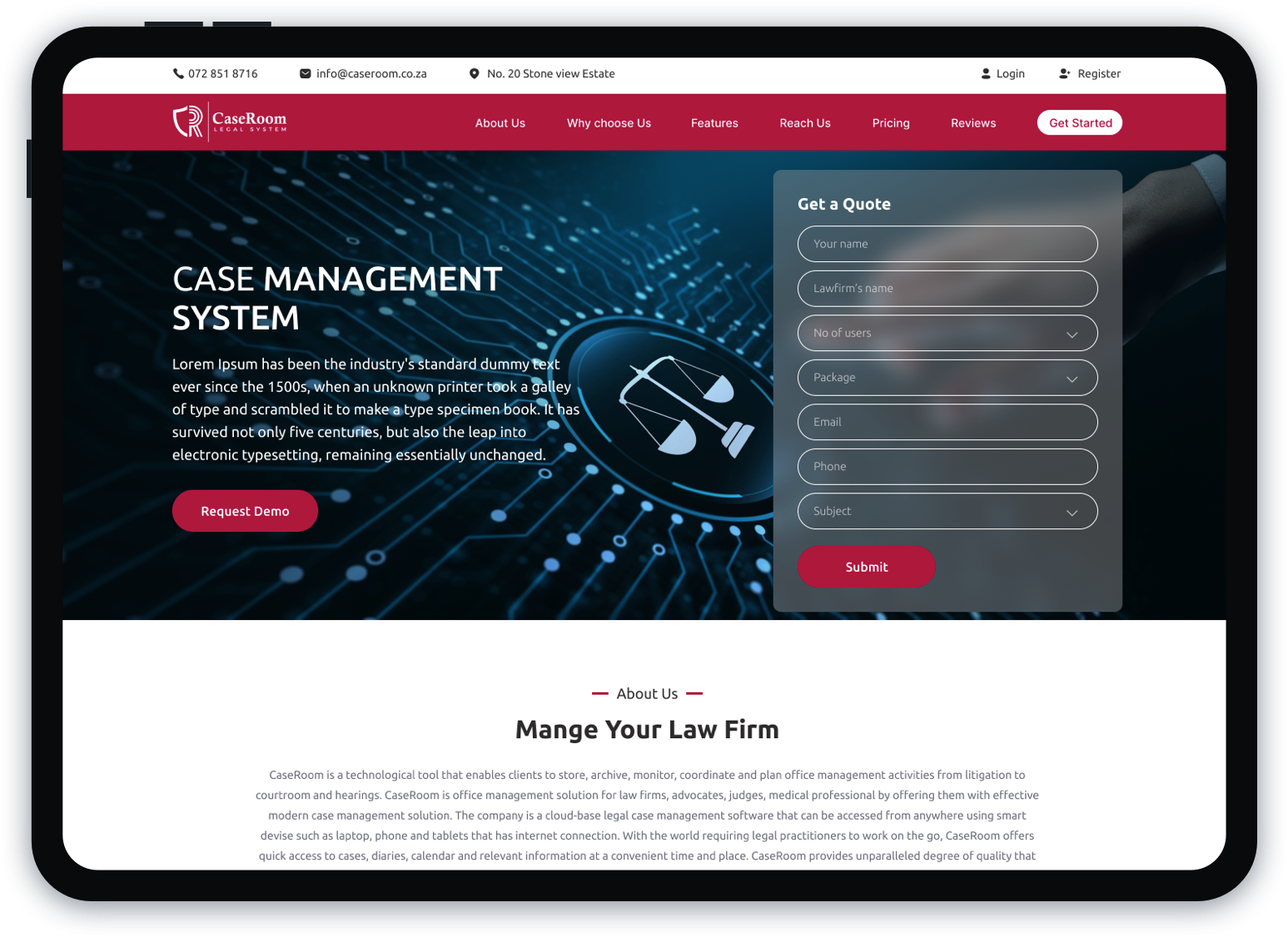 CaseRoomCaseroom legal system is a web application that enables clients to store, archive, monitor, coordinate and plan office management activities from employee management , litigation, hearings and accounting.